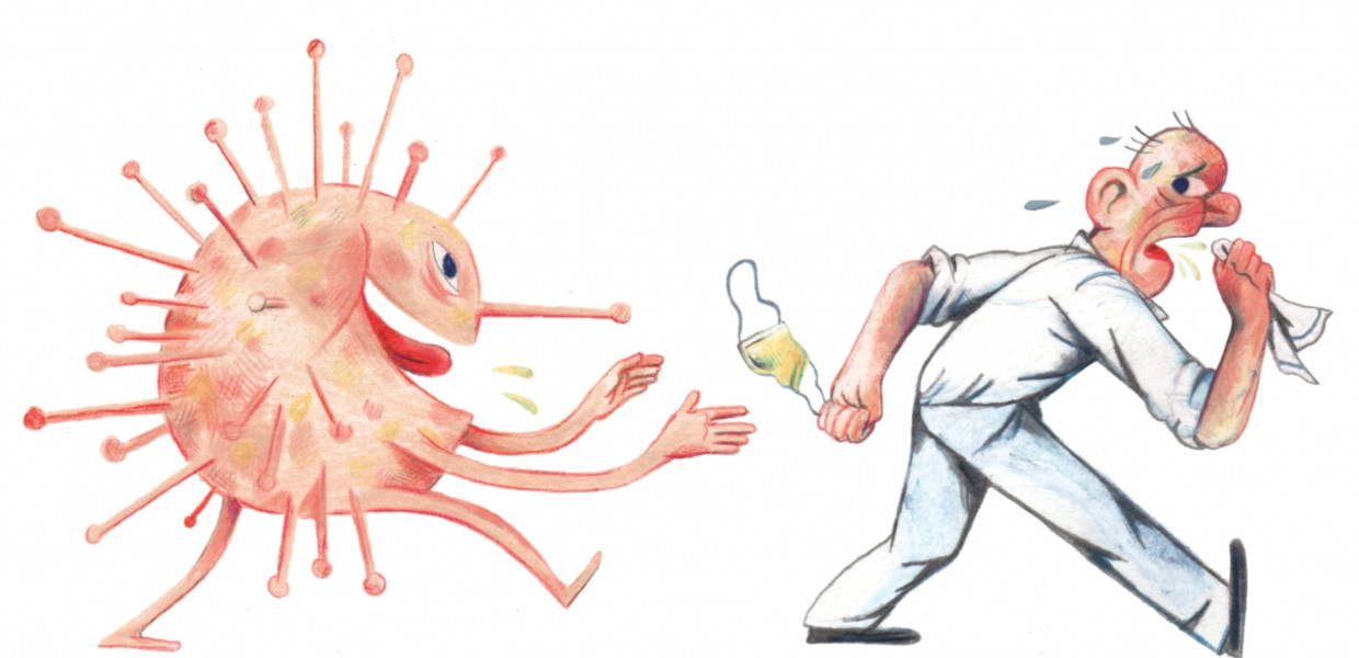 Vector Cartoon Illustratie van Man Chasing Coronavirus COVID-19 Virus met Desinfectie of Desinfectiemiddel — Stockvector © ursus@zdeneksasek.com #361125336